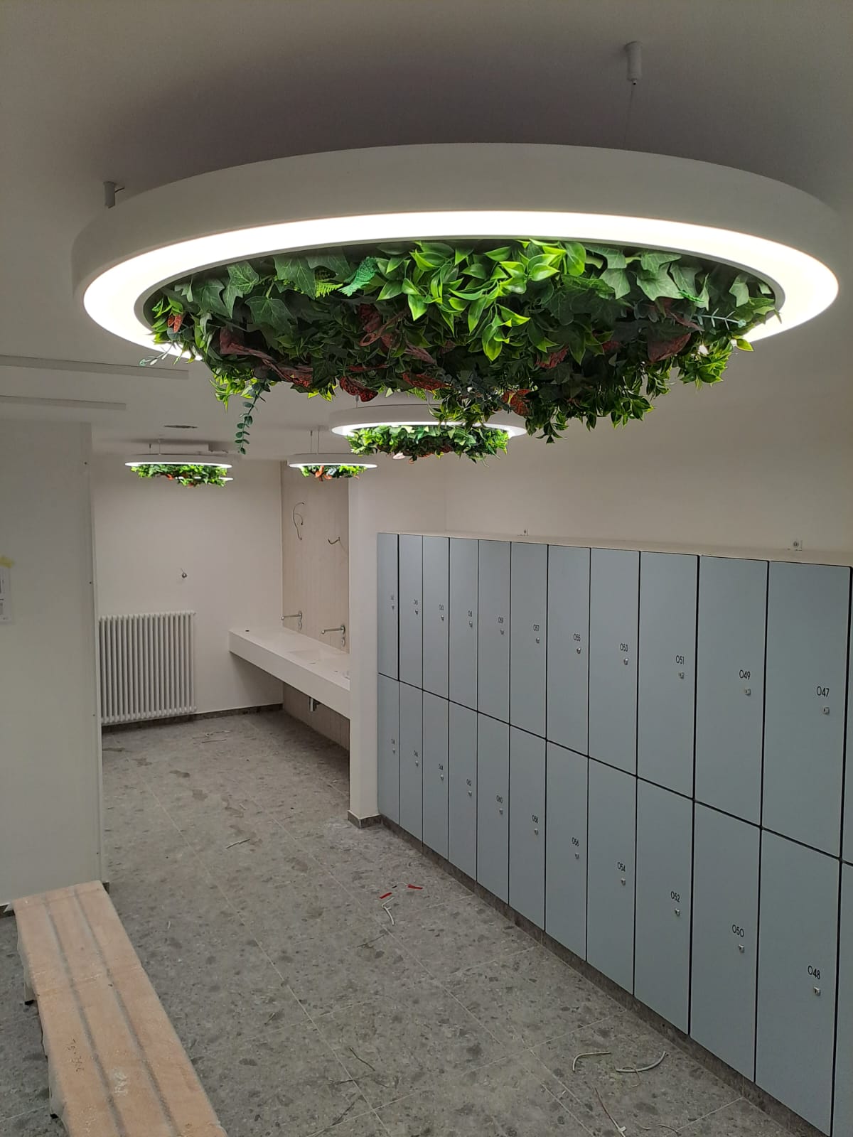 . These lights perfectly blend illumination with natural elements. The bright light outlines the circular shape, and the lush greenery inside is like a hanging garden, injecting a refreshing and vibrant touch into the space. Whether in the changing rooms or leisure areas, visitors can relax and feel the harmonious beauty of the combination of nature and modern design, creating a unique and comfortable environment for the park.