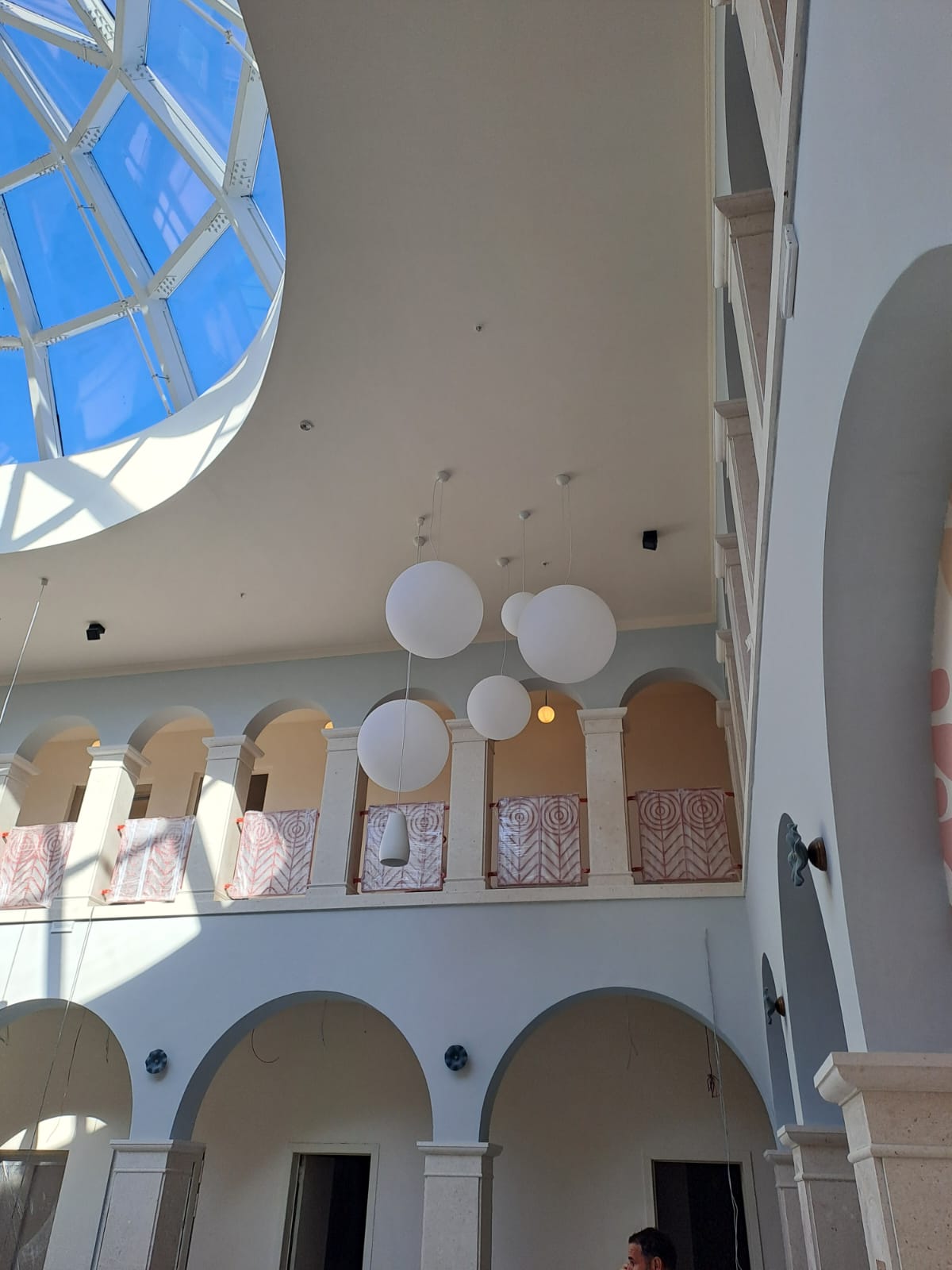 The white spherical shapes are simple and smooth, full of a modern sense. They are arranged in a well – proportioned, staggered manner, creating a layered light and shadow effect in the large – scale space. These lights not only provide ample illumination but also enhance the stylish flair of the space, making visitors feel as if they are in a modern space full of artistic atmosphere.