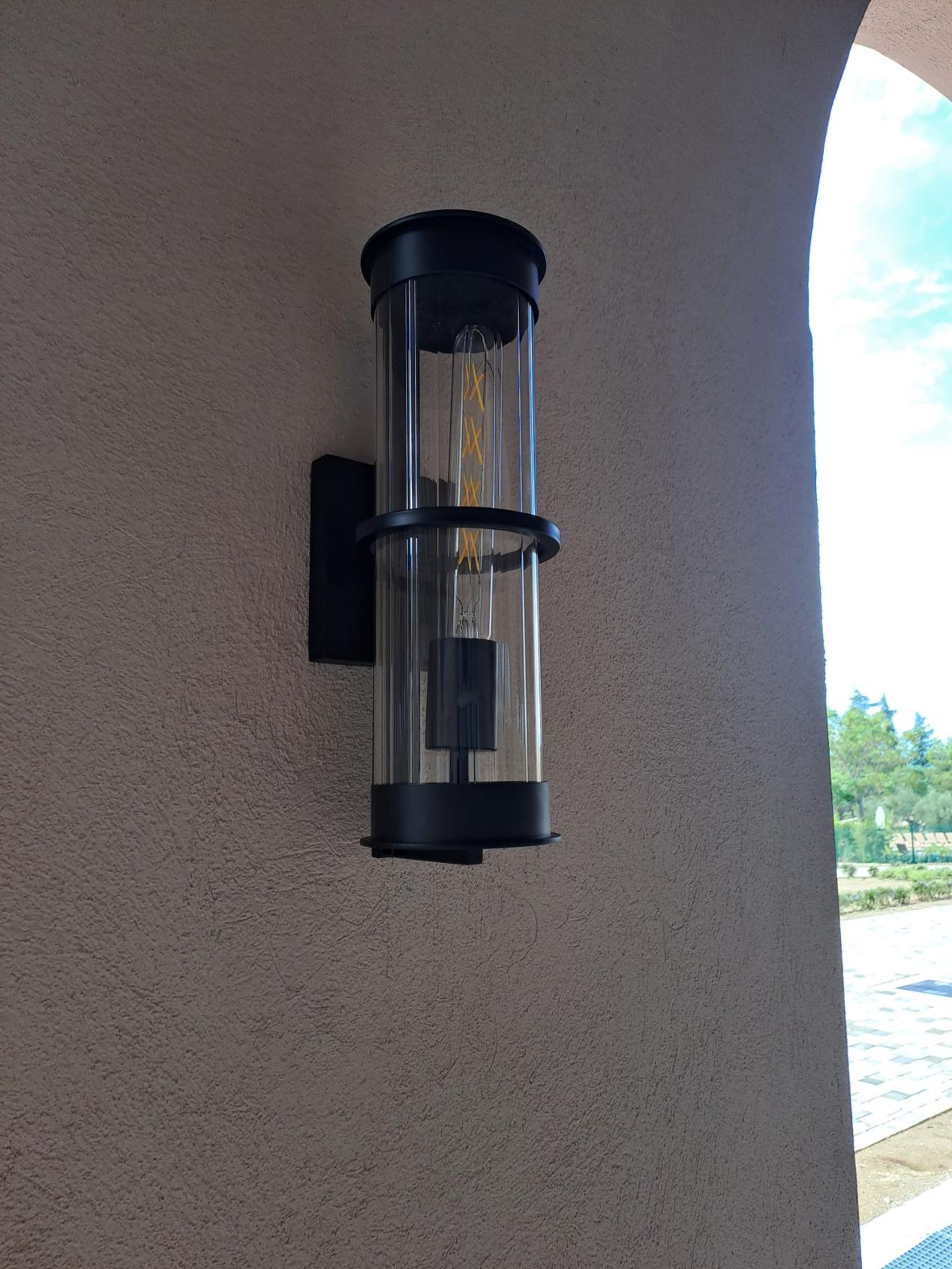 The wall – mounted lights in the outdoor area are equally remarkable. Made of black metal with transparent shades, they feature a tough and neat design, and the vintage bulbs emit a warm glow.
